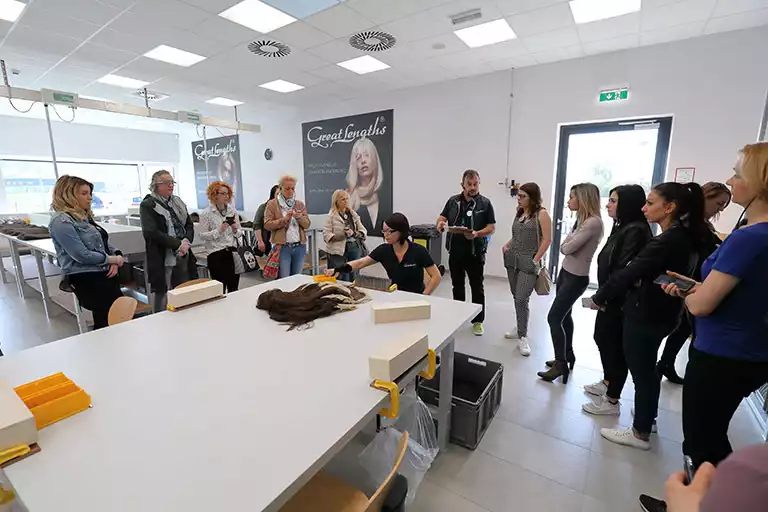 Montag ging es zum Abschluss des Weekends von Graz nach St. Stefan, um dort die neue Produktionsstätte von Great Lengths zu besichtigen. Jede Stunde kam ein neuer Bus mit Partnern an. Anita Lafer hatte den ganzen Vormittag nichts anderes zu tun, als die wissbegierigen Gäste durch die Produktion zu führen. Aber es machte ihr natürlich einen Riesenspaß: „Kann es etwas Schöneres geben, als begeisterten Partner zu zeigen, wie die Qualität entsteht, mit der wir alle gemeinsam so erfolgreich sind!“