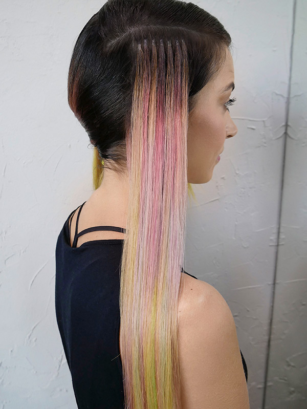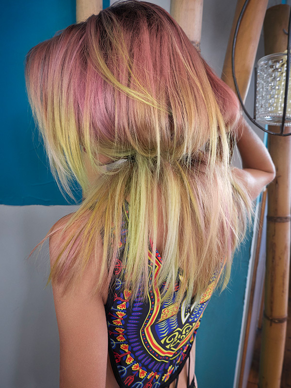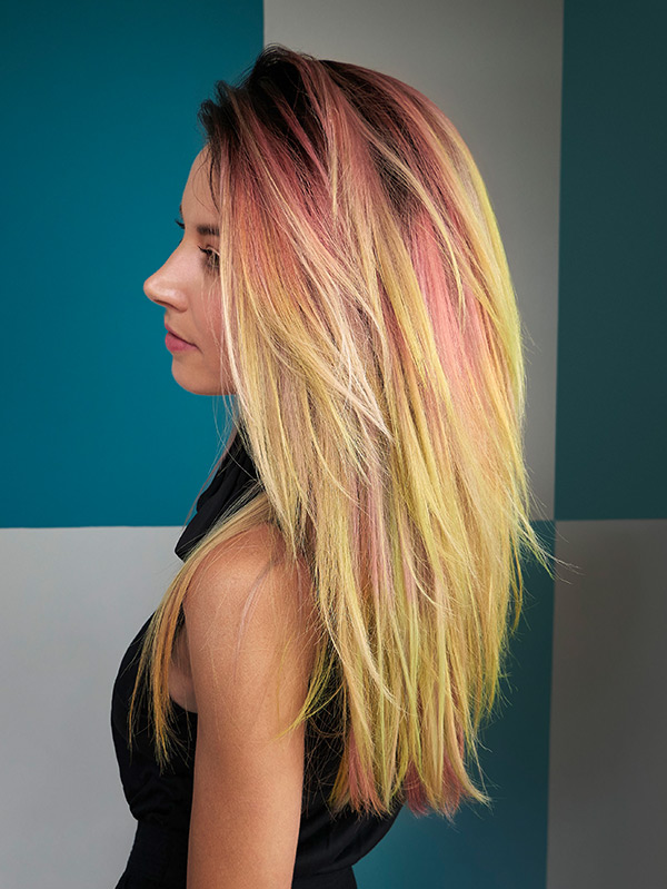 Das französische Wort „balayer“ bedeutet soviel wie „fegen“ oder „frei aufpinseln“. Und das ist bekanntlich die Technik, mit der Balayage-Looks erzeugt werden. Mario dringt dabei in eine völlig neue Farbwelt vor: Gelb, Pink und ein Hauch von Grün prägen das Bild. Eigentlich Farben, die gewöhnlich als bunt erlebt werden. Bei diesem Look wirken sie dennoch elegant, weil der dunklere Bereich am Oberkopf immer den nötigen Halt gibt.