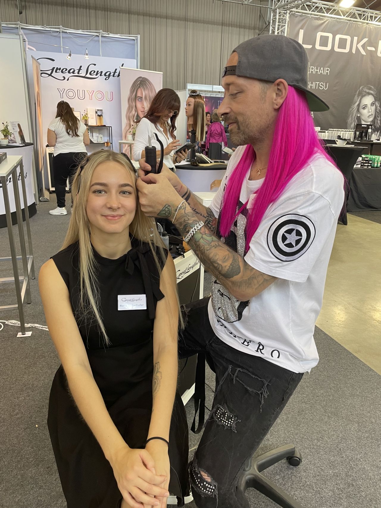 Ein tolles Highlight war die Kooperation mit Schwarzkopf, die eine kreative Fotobox mit einer einzigartigen Haar-Schaukel bereitgestellt haben. Die starken Haare wurden von Great Lengths gesponsert. Hier konnten die Besucher ihr Messe-Erlebnis mit einem Foto festhalten. Am Stand wurde auch fleißig eingearbeitet: Pre-Bonded Strähnen, GL Tapes und die neuen GL Wefts, die im Frühling 2025 gelauncht werden, waren ein großer Anziehungspunkt.