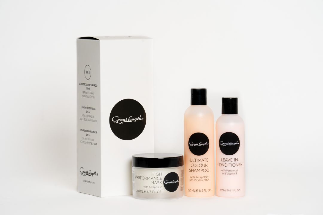 Spezielle Produkte, die sich besonders für coloriertes Haar eignen, sorgen dafür, dass die Struktur, die Farbe und vor allem der Glanz erhalten bleiben. Für diesen gesunden, strahlenden und gepflegten Look empfehlen wir die Haarpflege Multibox Ultimate Color von Great Lengths, bestehend aus: Ultimate Color Shampoo 250 ml, Leave-In Conditioner 200 ml und High Performance Mask 200 ml.